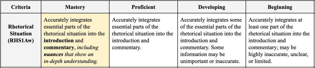 At the start of a new priority target in a unit, I begin with an overview of the rubric row. I highlight the mastery box because the goal is for all students to achieve that level. It’s just an introduction, but I emphasize some key words that will be important in our work with the target.