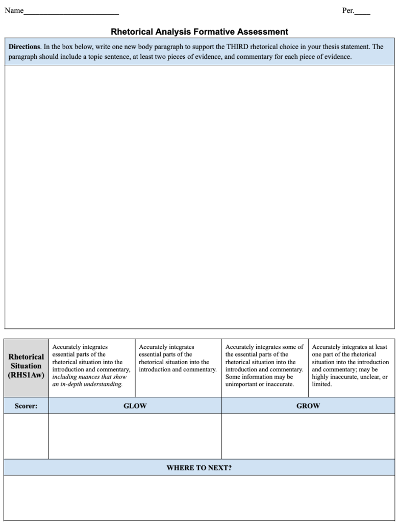 As shown in the example to the right, I ask students to give a “glow” (something done well), a “grow” (something that can be better), and a next step. During this process, I provide examples of feedback and give oral feedback on students’ written feedback. I also try to share student examples of effective feedback that is specific, detailed, and rubric-aligned.