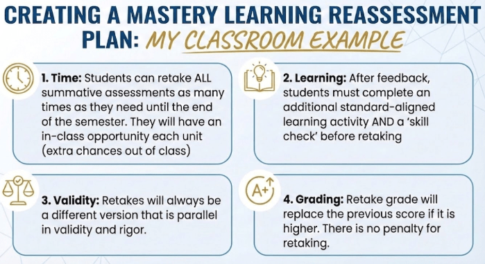So, because it is a systemic process, all students have this opportunity — not just those who ask for a retake or have a compelling reason to try again. And teachers can communicate the policy transparently, which builds trust and equity in the classroom. When the system is designed strategically, it is efficient for both teachers and students, preventing the stress and burnout that commonly accompany reassessment.