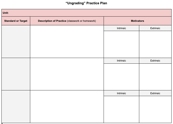 Below is a tool to plan and prepare for implementing ungraded practice, which connects to my post on the topic. Space is provided to determine at least one practice for each target and plan the specific form of motivation (intrinsic or extrinsic) that will replace the extrinsic motivation of grades. Here is the template as a Google Doc.