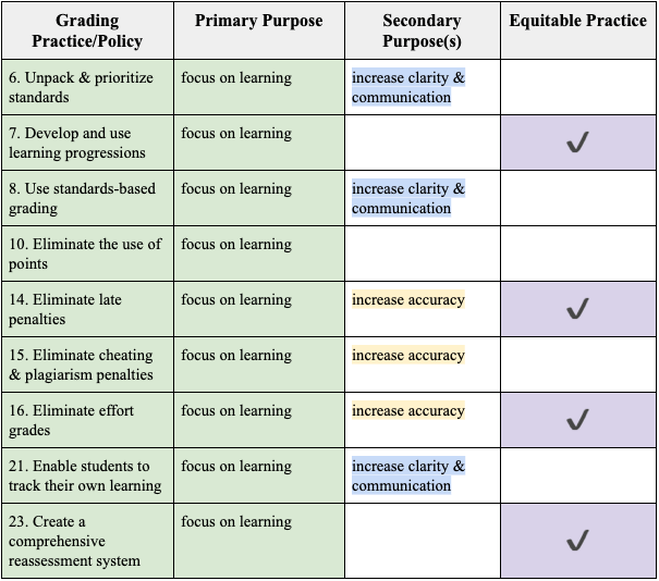 I’ve identified the primary purpose of the following nine grading practices as focus on learning. Please see the resources for each practice for a better understanding (many of which I’m currently developing/revising).